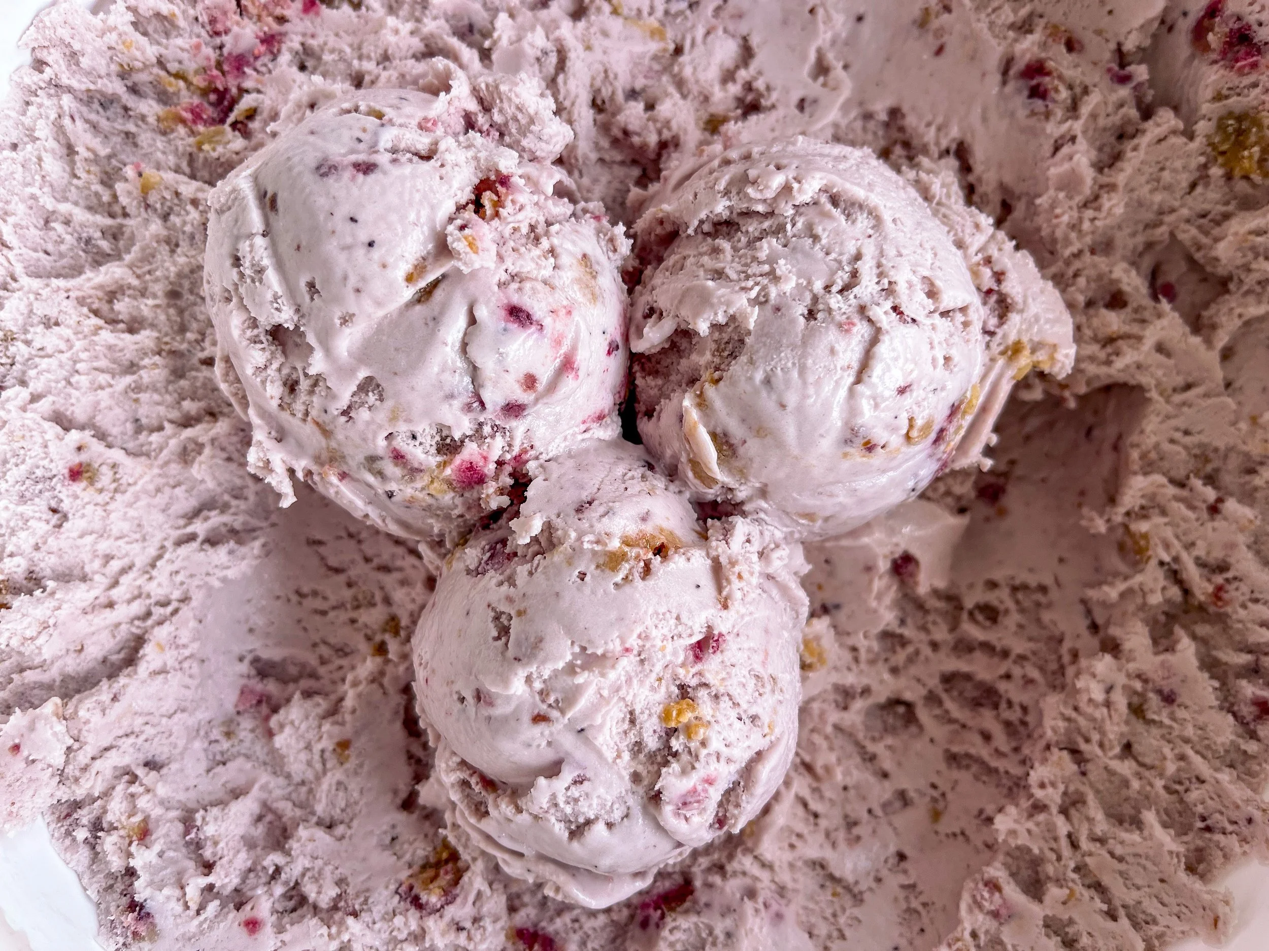 This flavor starts with baking a real cheese cake with strawberries and blueberries mixed throughout. Once that cheese cake is finished and cooled its chopped up and put into a cream cheese base ice cream and its all swirled with more strawberries! Super decadent!!